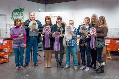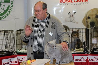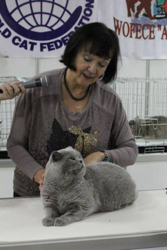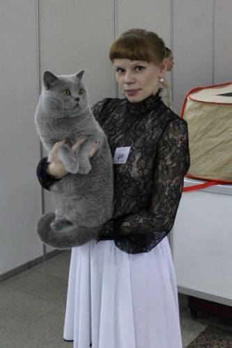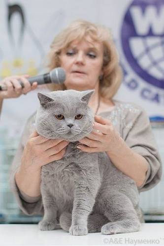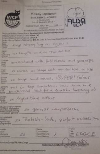 ___________________________________________________________________________________________ 08-09 нояб Международная выставка кошек Очей Очарованье г.ВологдаЛицензия № 141295 1 день - CAGCE 2 день - CAGCE. WCF RING ADULTS 3 место ,Номинация BIS Комментарии экспертов:Голова: Очень крупная,округлых,отличных линий,с прекрасным переходом,отлично наполнена мордочка,прекрасно наполнены щеки.(Ольга Беляева) Глаза: Яркие,лучистые,золотистые,обаятельные.(Алла Максименко) Уши: Отличной формы и постава.(Алла Максименко) Тело: Очень крупное,мощное,крепкого атлетического сложения.(Ольга Беляева) Шерсть: Короткая,густая,голубого окраса с серебристым отливом.(Алла Максименко) Хвост: Корректный.(Алла Максименко) Кондиция: Выставочная.(Алла Максименко) Дополнения: Уравновешенный,с отличной психикой.(Ольга Беляева)