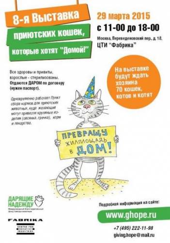Итак, время работы выставки - 29 марта (воскресенье), с 11-00 до 18-00 в Арт-центре Фабрика (Москва, Переведеновский пер. д.18, метро Электрозаводская) . Искать себе хозяев приедут 70 мартовских котов, кошек и котят (от 4-х месяцев). Все здоровенькие, привитые, взрослые коты и кошки - стерилизованы. Отдаются бесплатно. по договору передачи животного, поэтому на выставку нужно взять с собой паспорт . Традиционно во время работы выставки будет открыт Пункт сбора кормов для особо нуждающихся приютов. Тех, где животные живут впроголодь. Поэтому нужен сухой корм для собак и кошек, влажный - для щенков и котят. Просьба - привозите в заводской упаковке . Нужны глистогонные препараты и ОСОБЕННО НУЖНЫ СРЕДСТВА ОТ КЛЕЩЕЙ! Ведь начался сезон, когда эти опасные насекомые активизировались, в клиниках уже зарегистрированы случаи пироплазмоза. НУЖНЫ препараты: Барс, Стронгхол, Инспектор, Фронтлайн. Серьёзно, это вопрос жизни и смерти многих-многих животных. Очень надеемся на наших прекрасных, небезразличных москвичей!